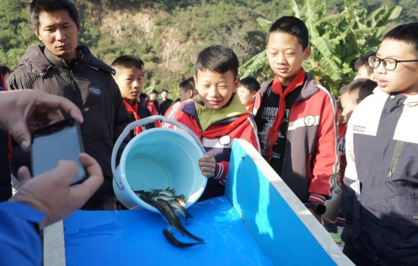 ▲松新镇小学生向黑水河放流珍稀特有鱼类