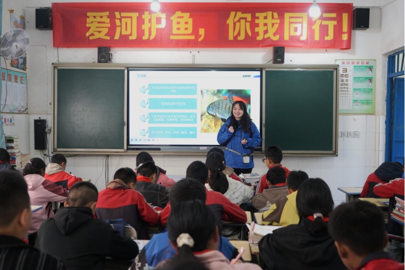 回到教室后,来自上海院的青年志愿者为孩子们讲授了一堂生动的爱河护鱼科普课。松新镇小学班主任刘应欢说:“我们有很多孩子的家在附近山上,参与放流活动能让他们亲近河流,体验保护珍稀鱼类的过程,让他们从小建立保护生态环境的认知。”