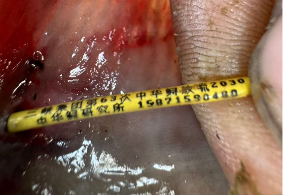 该中华鲟体长约1.3米,体重45斤,背鳍上带有标记有放流信息的T型标记(此标记是一种悬挂在背鳍上的体外标记,该标记上印有编号、放流单位和联系电话,方便沿江群众发现放流中华鲟时,能及时联系到科研人员进行救护)。随后,渔民和相关部门在确认鱼体健康无碍的情况下,将该尾中华鲟放归海中。