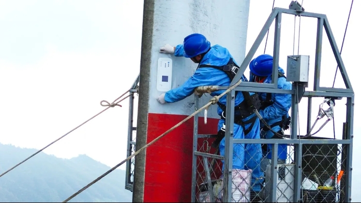 ▲运维人员正在为风机叶片贴覆冰监测传感器。推广应用该“电子皮肤”成果以后,运维人员无需再冒严寒、登高履危地进行人工复核。