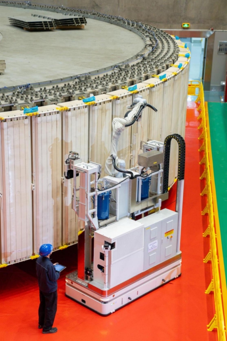 ▲2025年12月,在全球最大水电站——三峡电站岁修现场,自行走机器人正对10号机组转子开展清洗作业。